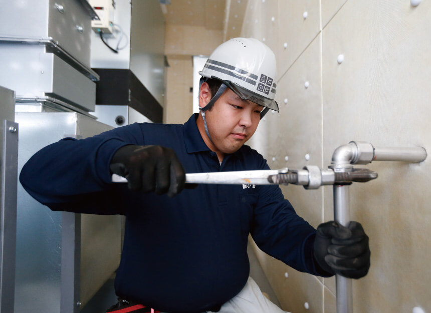 入社してからは設備工事や土木工事などさまざまな現場をローテーションで学び、現場研修後は新築物件の設備工事チームで数年間業務を行いました。最近漏水チームに移り、水回りについて日々学んでいます。水漏れの原因を突き⽌めて、きっちりと⽌められたときはうれしいですね。お客様からも感謝されますし、やりがいのある仕事だなと思います。「次の工事も佐野さんに来てほしい」と⾔われることがうれしいです。